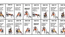 24 Days Reverse Grip Bent Over Row (10X) Calf Press (15X) Straight Bar PushDown (X10) Arnold Press (X10) Plank (1 Minute) Weighted Crunch (X20) DeadLift (X10) DumbBell Rows (X5)