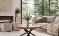 Modern Round 42″ Walnut Coffee Table Exploring Simplicity, the perfect reading chair(s) and ottoman Then I conjured up the Black Walnut Altar of St James and decided on the simplicity of a round walnut coffee table, dominating a simple room